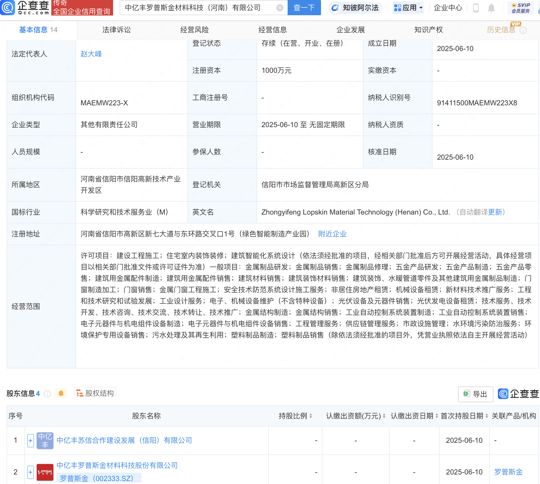 近日,中亿丰罗普斯金材料科技(河南)有限公司成立,注册资本1000万元,经营范围包含:建设工程施工;住宅室内装饰装修;建筑智能化系统设计等。股权穿透显示,该公司由罗普斯金(002333)等共同持股。