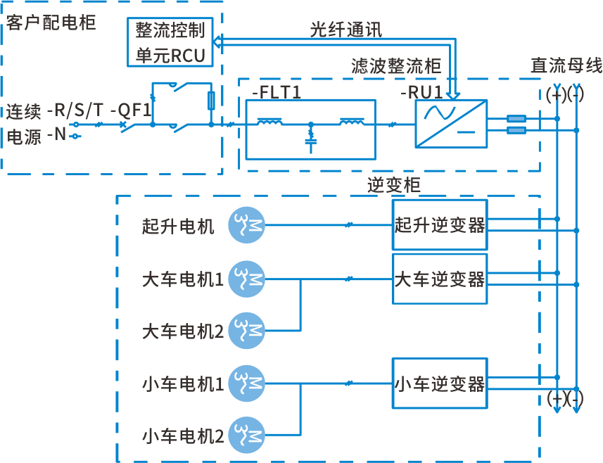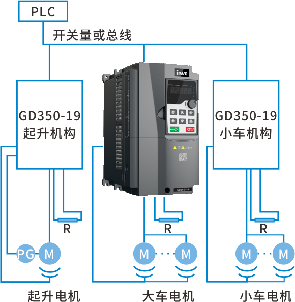 采用新一代GD350-19高性能起重专用变频器,先进的电机矢量控制算法,低频大转矩,响应速度快,结合多种起重专用功能,确保设备安全高效运行。