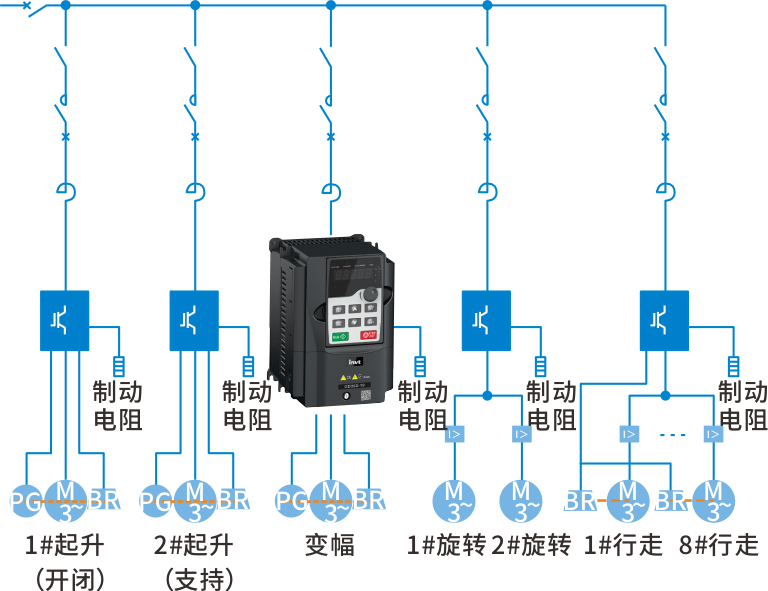 采用新一代GD350-19高性能起重专用变频器,针对门座机起升、俯仰、旋转、行走机构设备需求,匹配设计专用应用功能,实现各个机构的平稳,高效运行。