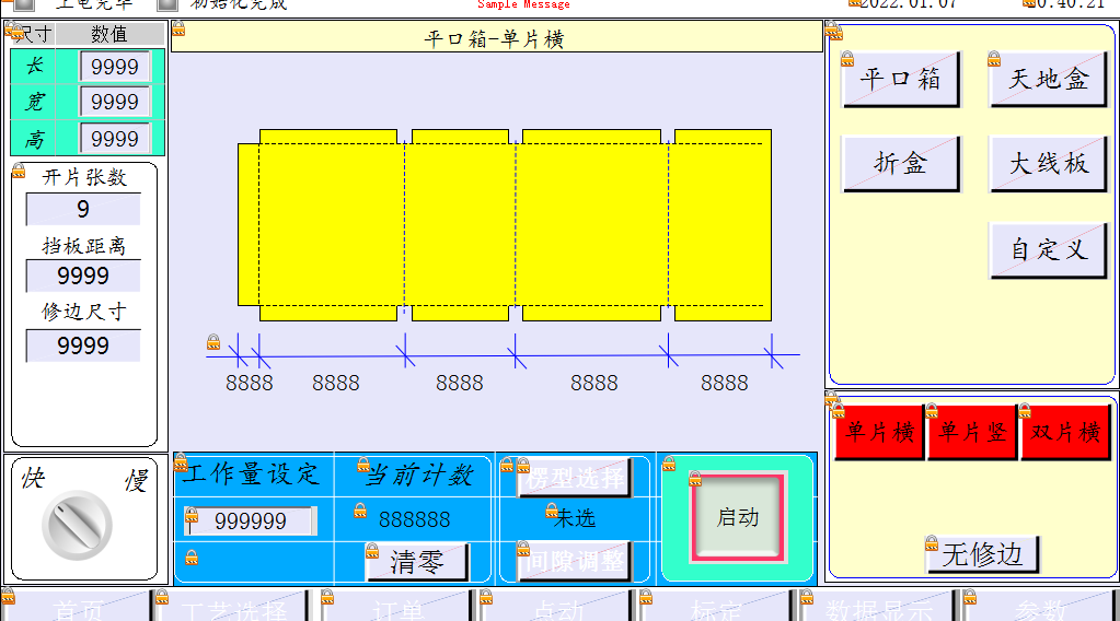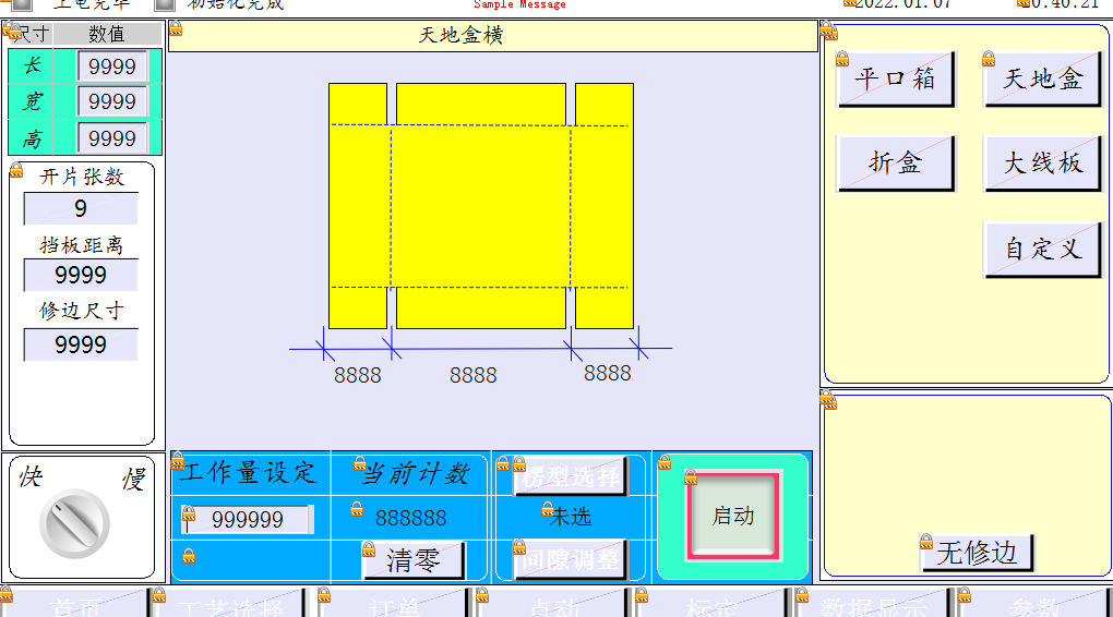 根据客户的需求,英威腾提供了IVC3系列+DA180系列单轴基础型伺服。该方案采用3000rpm的高转速伺服电机换单定位精准快速,在触摸屏交互方面,系统内置平口箱、天地盒、大线板、折盒等多种生产样式,可根据生产需求快速选用,极大的方便了客户使用。