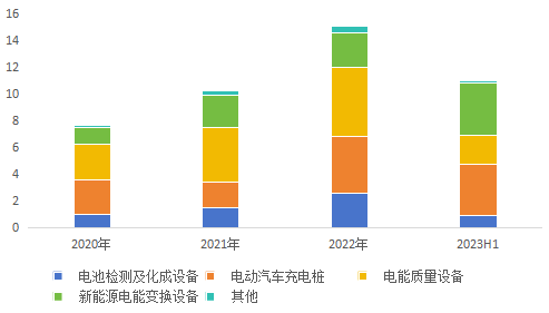 2023H1,新能源电能变换设备收入3.8亿元,占比35.3%;电动汽车充电桩业务收入3.84亿元,占比34.85%;电能质量设备收入2.14亿元,占比19.42%;电池检测及化成设备收入0.93亿元,占比8.44%。