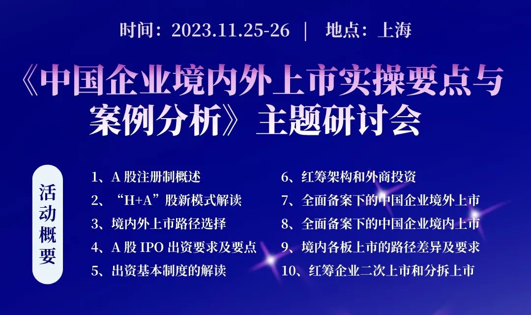 2023年11月25日-26日,并购优塾将在上海举办为期两天的《中国企业境内外上市实操要点》主题研讨会。