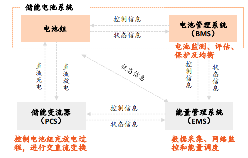 完整的电化学储能系统,由电池组、储能变流器(PCS)、电池管理系统(BMS)和能量管理系统组成(EMS)。