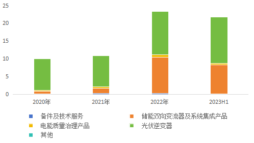 2023H1光伏逆变器收入13.03亿元,占比59.83%;储能双向变流器及系统集成产品收入8.18亿元,占比37.56%;电能质量治理产品收入0.43亿元,占比1.97%。