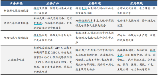 目前公司主要有四大支柱业务,分别为工业配套电源、新能源电能变换设备、电动汽车充电桩与电池化成与检测设备。