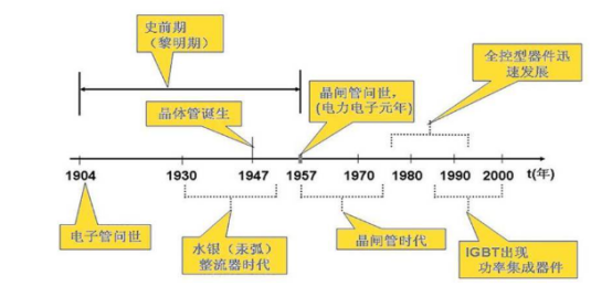 首先,晶闸管时代。电力电子技术的诞生,以1957年美国通用电气公司研制出的首个晶闸管为标志,是通过对门极的控制使其能够导通而不能关断的器件,依靠电网电压等外部条件来实现(相控方式),应用局限性较大。