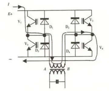 其技术原理,以逆变为例,四个开关管V分为两组,V1和V4为一组、V2和V3为二组。当一组导通时,电流从电源正极出发,通过变压器的初级绕组AB回到负极,形成下图所示的正半波;当二组导通时,电流从电源正极出发,经由反向通过变压器初级绕组BA回到负极,形成下图所示的负半波。简而言之,就是在控制信号的反复作用下,两组开关管成对、交替导通,从而获得连续的交流输出。