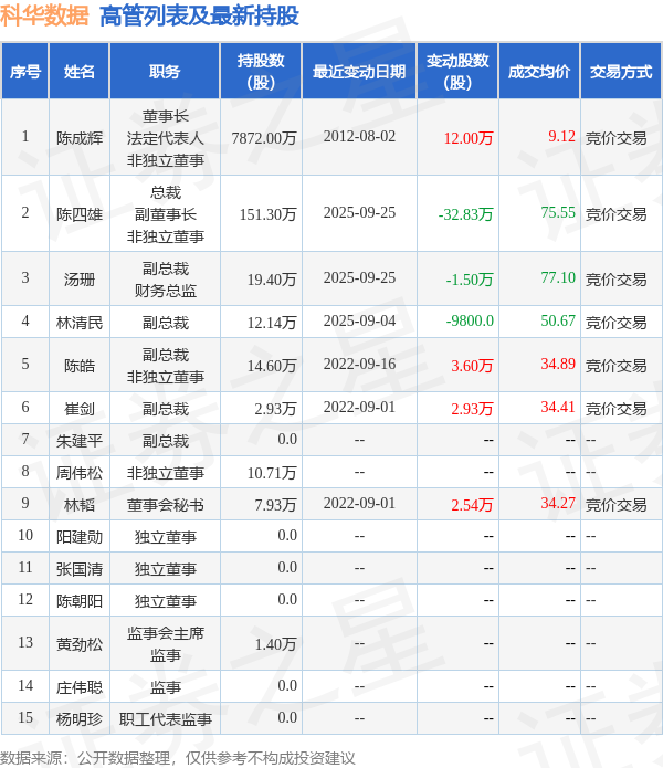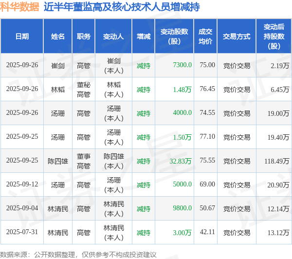科华数据近半年内的董监高及核心技术人员增减持详情如下:
