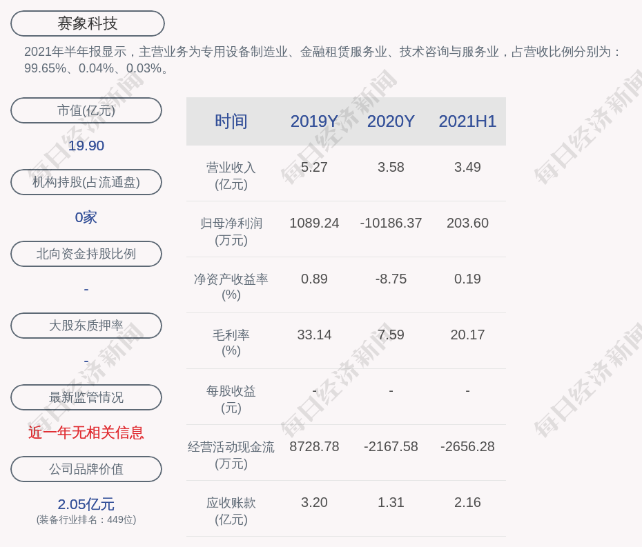 2021年半年报显示,赛象科技的主营业务为专用设备制造业、金融租赁服务业、技术咨询与服务业,占营收比例分别为:99.65%、0.04%、0.03%。