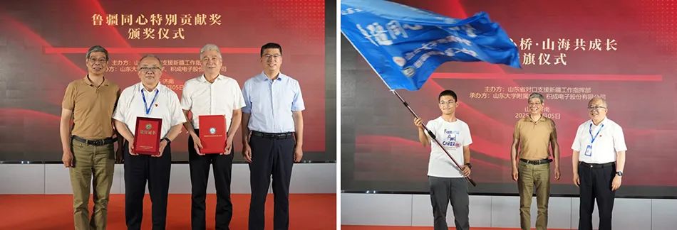 仪式现场,积成电子董事长王良、总经理严中华与山东山大基础教育集团总校长赵勇、喀什第二中学副校长王志民等嘉宾共同见证了多个重要环节:赵勇校长、王志民校长向积成电子颁发“鲁疆同心特别贡献”荣誉证书及感谢信,肯定企业为活动提供的全程支持;在授旗仪式中,王良董事长与赵勇校长共同将研学营旗授予学生代表,象征鲁疆两地情谊的传承。
