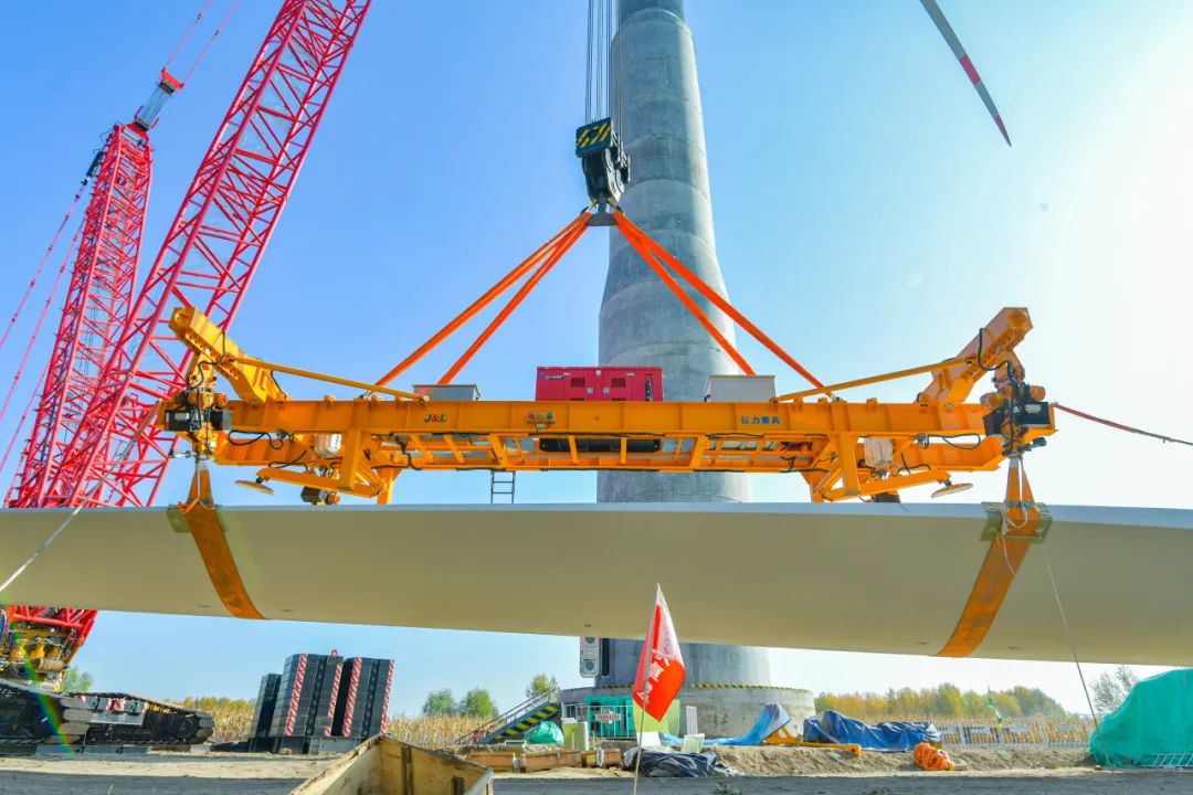 近日,中广核吉林吉西基地鲁固直流140万千瓦外送项目2-1(风电场260MW)工程首吊风机完成吊装。巨力索具60KNM盘车工装和5MW单叶片吊具全程保障其顺利吊装。