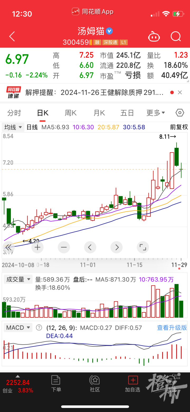 “谷子经济”令汤姆猫表现活跃。近1个月来,其股价累计上涨37.38%,同期创业板指涨幅为0.92%。11月19日至27日,其间涨幅57.38%,最新市值250.7亿元,一度刷新今年内股价最高位。