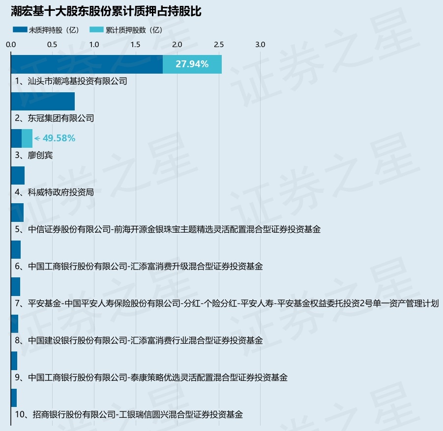 截止本公告日,股东汕头市潮鸿基投资有限公司已累计质押股份7086.0万股,占其持股总数的27.94%,股东廖创宾已累计质押股份1300.0万股,占其持股总数的49.58%。本次质押后潮宏基十大股东的累计质押股份占持股比例见下图:
