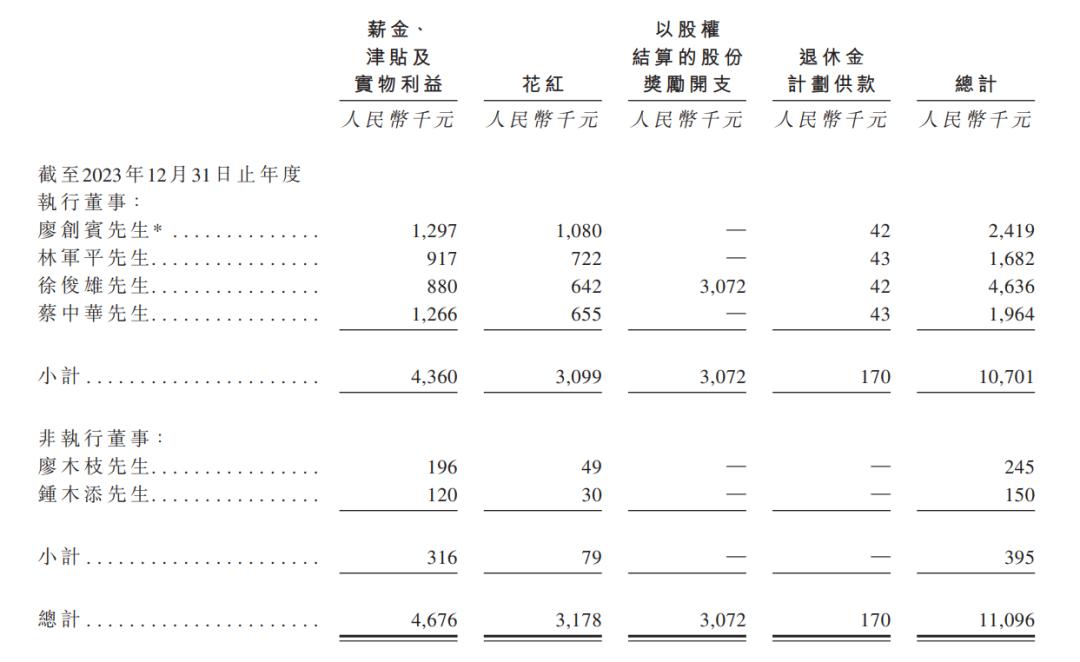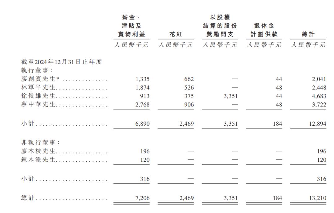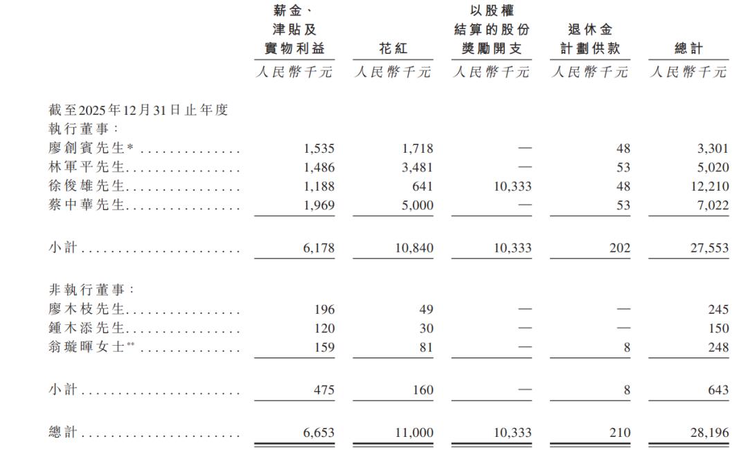 2023年,廖木枝、林军平及廖创宾分别领薪24.5万元、168.2万元、241.9万元;2024年,三人分别领薪19.6万元、244.8万元、204.1万元;2025年,三人分别领薪24.5万元、502万元、330.1万元。