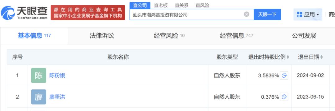据《港派IPO》梳理,廖坚洪已于2020年4月因个人原因,辞任潮宏基监事及监事会主席职务。另据信息显示,2023年6月,他已不再是潮鸿基投资的股东,退出前的持股比例仅0.376%。