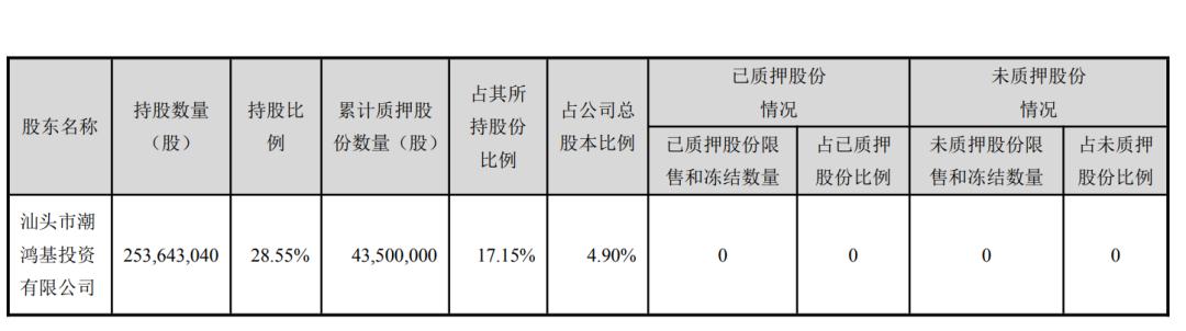 2026年3月18日,控股股东潮鸿基投资将所持2950万股股份质押给红塔证券股份有限公司(以下称“红塔证券”),质押用途为融资。按当天收盘价10.50元计算,该笔质押股份市值约为3.1亿元。