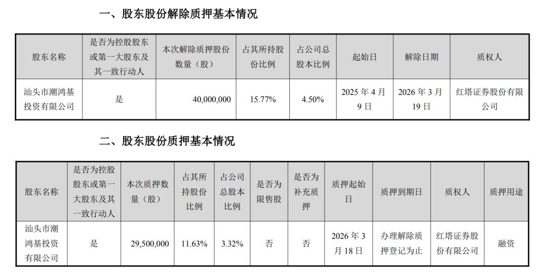 次日(3月19日),潮鸿基投资又向同一质权人红塔证券解除了4000万股股份的质押登记,这笔质押起始于2025年4月9日,彼时收盘价8.16元/股,对应市值与新质押股份基本持平。