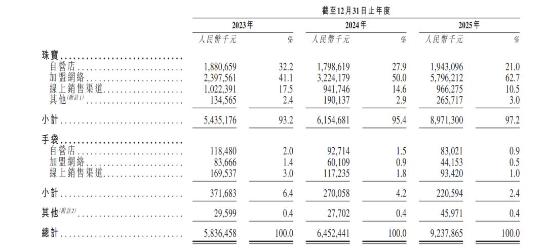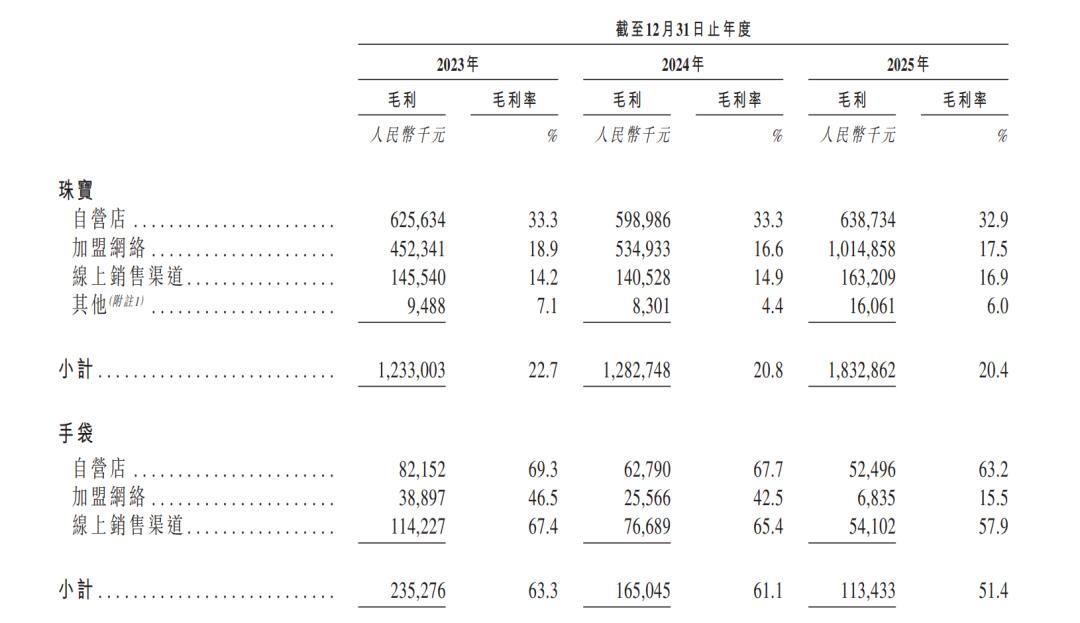 2025年,潮宏基来自珠宝加盟网络的收入同比大增79.77%,达到57.96亿元,占总营收比重首次突破六成,达62.21%。但招股书数据揭示了一个残酷的真相:加盟业务毛利率仅为17.5%,而自营渠道仍能维持32.9%的水平。