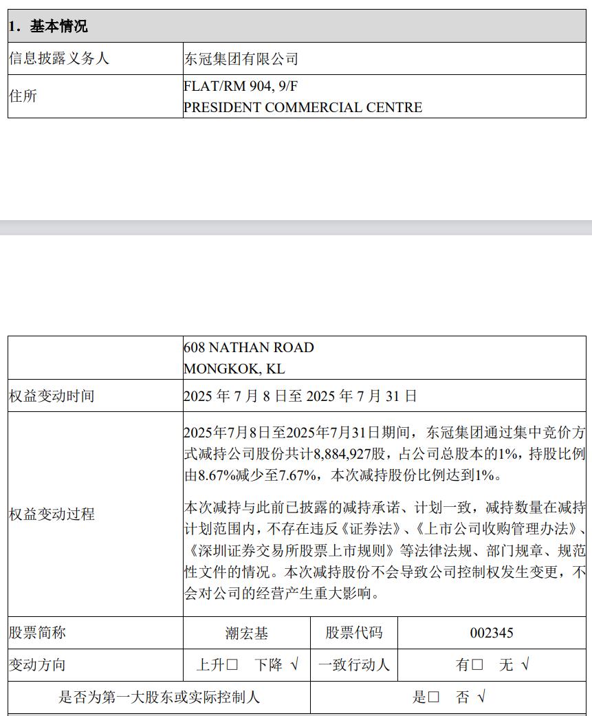 不过,《港派IPO》发现,2025年7月8日至2025年7月31日,东冠通过集中竞价的方式减持了潮宏基共计8,884,927股A股股份,占公司总股本的1%。