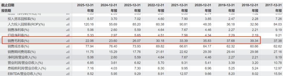 但规模快速扩张的背后,盈利质量的隐忧已愈发明显。拉长周期可见,潮宏基毛利率已连续七年下滑,从2018年的39.34%一路降至2025年的22.06%。