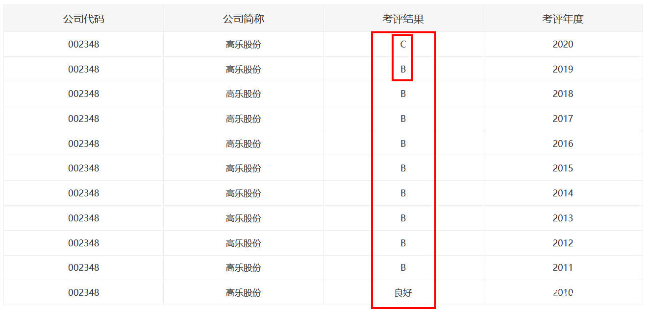 据投研电讯信披质量研究院统计,自2010年2月3日在深交所上市,高乐股份在深交所11次年度信息披露考评中,10次为B(或良好)、1次为C。投研电讯注意到,7月12日,深交所上市公司2020年信披考评结果出炉,高乐股份最新信披考评由B降C。