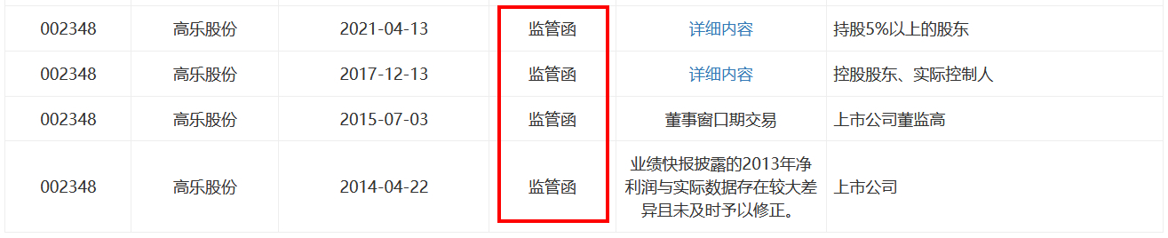 2014年4月22日至2021年4月13日,高乐股份、公司董监高、控股股东兼实控人、持股5%以上的股东分别因预计与实际净利差异较大且未及时修正、董事窗口期交易、未在公告披露的计划增持期限内完成增持公司股票的计划、公司未在减持行为发生的15 个交易日前未披露减持计划等违规行为,收到深交所出具的监管函。