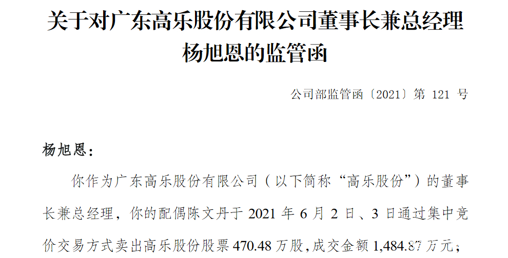 深交所监管函称,高乐股份董事长兼总经理杨旭恩的配偶陈文丹于2021年6月2日、3日通过集中竞价交易方式卖出高乐股份股票470.48万股,成交金额1,484.87万元;于6月3日通过集中竞价交易方式买入高乐股份股票20万股,成交金额59.8万元。上述买入和卖出行为间隔不足六个月,构成短线交易。杨旭恩未能督促配偶合规交易高乐股份股票,违反了深交所《股票上市规则》和《上市公司规范运作指引》相关规定。深交所要求杨旭恩充分重视上述问题,吸取教训,及时整改,杜绝上述问题的再次发生。
