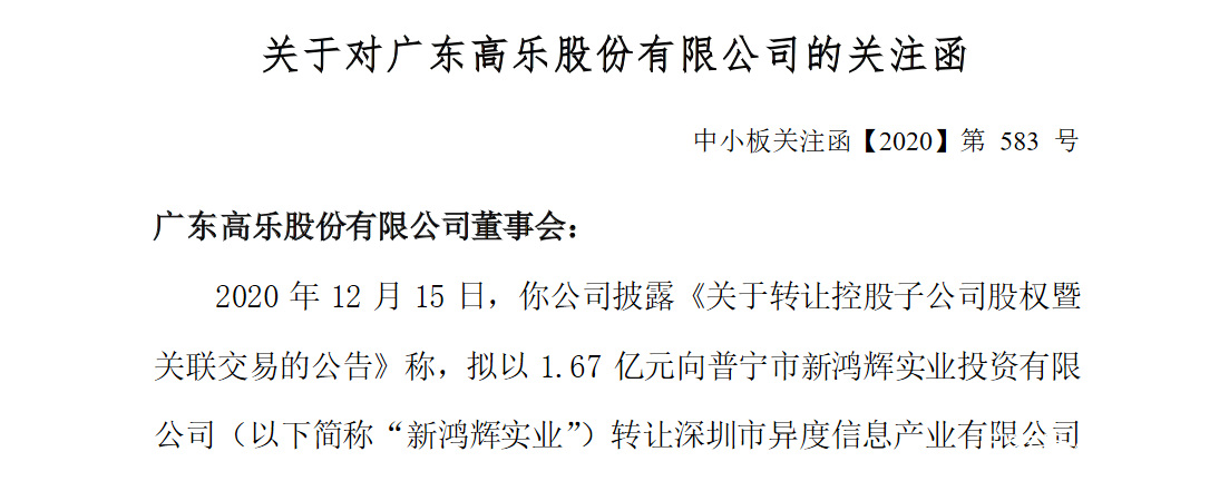 2020年12月15日,深交所向高乐股份发布关注函称,根据《关于转让控股子公司股权暨关联交易的公告》,高乐股份拟以1.67亿元向新鸿辉实业转让异度信息53.25%的股权。新鸿辉实业是高乐股份实际控制人的关联方,本次交易构成关联交易,公司将该事项提交股东大会审议。深交所要求高乐股份结合公司未来发展战略及异度信息经营情况、公司对其控制情况,说明出售异度信息的具体原因;结合异度信息收购与增资价格及可比公司估值情况,说明交易价格确定的依据与公允性等事项,同时因异度信息最近一期财务数据未经审计,不符合深交所《股票上市规则》相关规定,要求高乐股份及时进行整改。