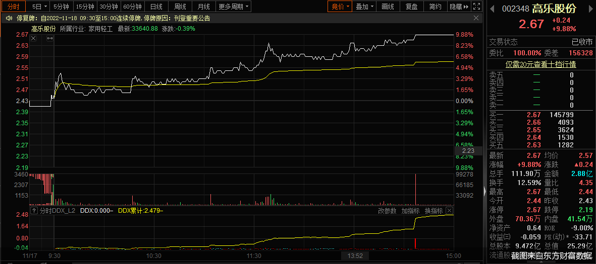 截至当日收盘,高乐股份报涨停价2.67元/股,在买一位置仍有近15万手买单在排队疯抢,当日换手率为12.59%,成交金额高达2.88亿元,较前几个交易日出现明显放量,最新总市值25.29亿元。