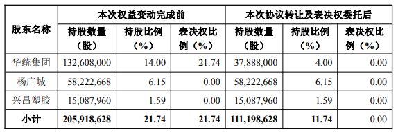 2025年11月30日, 华统集团有限公司 与杨广城、興昌塑膠五金廠有限公司签署《一致行动人协议之解除协议》和《表决权委托协议之解除协议》, 华统集团有限公司 将与杨广城、興昌塑膠五金廠有限公司解除一致行动关系和表决权委托。