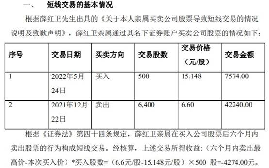 根据《证券法》第四十四条规定,薛红卫亲属在买入公司股票后六个月内卖出股票的行为构成短线交易。经核算,上述交易所得收益-4274.00元。