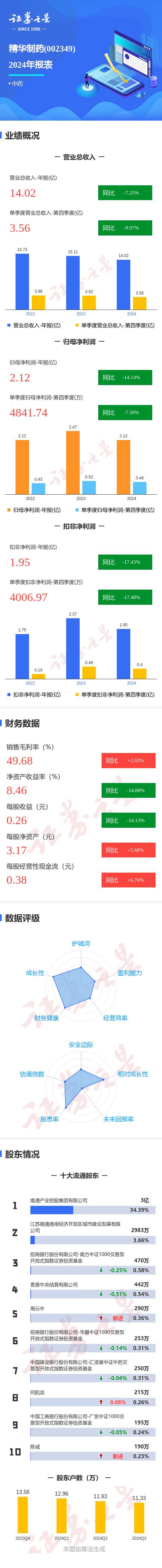 精华制药2024年年报显示,公司主营收入14.02亿元,同比下降7.25%;归母净利润2.13亿元,同比下降14.15%;扣非净利润1.96亿元,同比下降17.43%;其中2024年第四季度,公司单季度主营收入3.57亿元,同比下降8.97%;单季度归母净利润4841.75万元,同比下降7.51%;单季度扣非净利润4006.97万元,同比下降17.48%;负债率10.44%,投资收益437.23万元,财务费用-4474.87万元,毛利率49.68%。