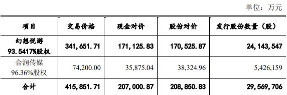 截至评估基准日2015年12月31日,幻想悦游经审计的账面净资产为7.40亿元;采用收益法评估的幻想悦游全部股权价值为36.52亿元,增值额为29.12亿元,增值率为393.26%。经各方友好协商,幻想悦游93.5417%股权交易价格为34.17亿元。
