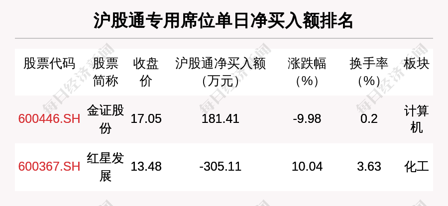 在龙虎榜中,涉及沪股通专用席位的个股有2只,金证股份的沪股通专用席位净买入额最大,净买入181.41万元。