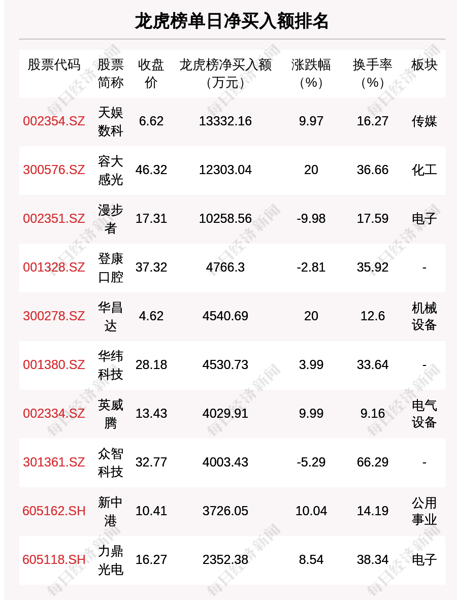 在龙虎榜中,涉及机构专用席位的个股有24只,净买入额前三的是登康口腔、漫步者、华纬科技,分别为5599.31万元、5096.94万元、4536.05万元。