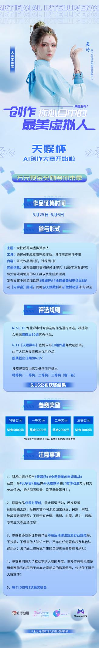 赛事活动将持续23天,自5月25日-6月16日,分为海选征集、专家评审、大众投票、奖项公布四个阶段,参赛者须以女性超写实虚拟数字人为主题,以AI生成应用为工具,在微博平台发布相关图片作品及设计理念,发布微博时添加话题#天娱杯##全网最美AI申请出战#及【元宇宙】超话,并同时@天娱数科@微博动漫即可参与评选。评审过程中,将邀请专家评委与广大网友共同参与,评选出优胜者共分万元现金奖励!