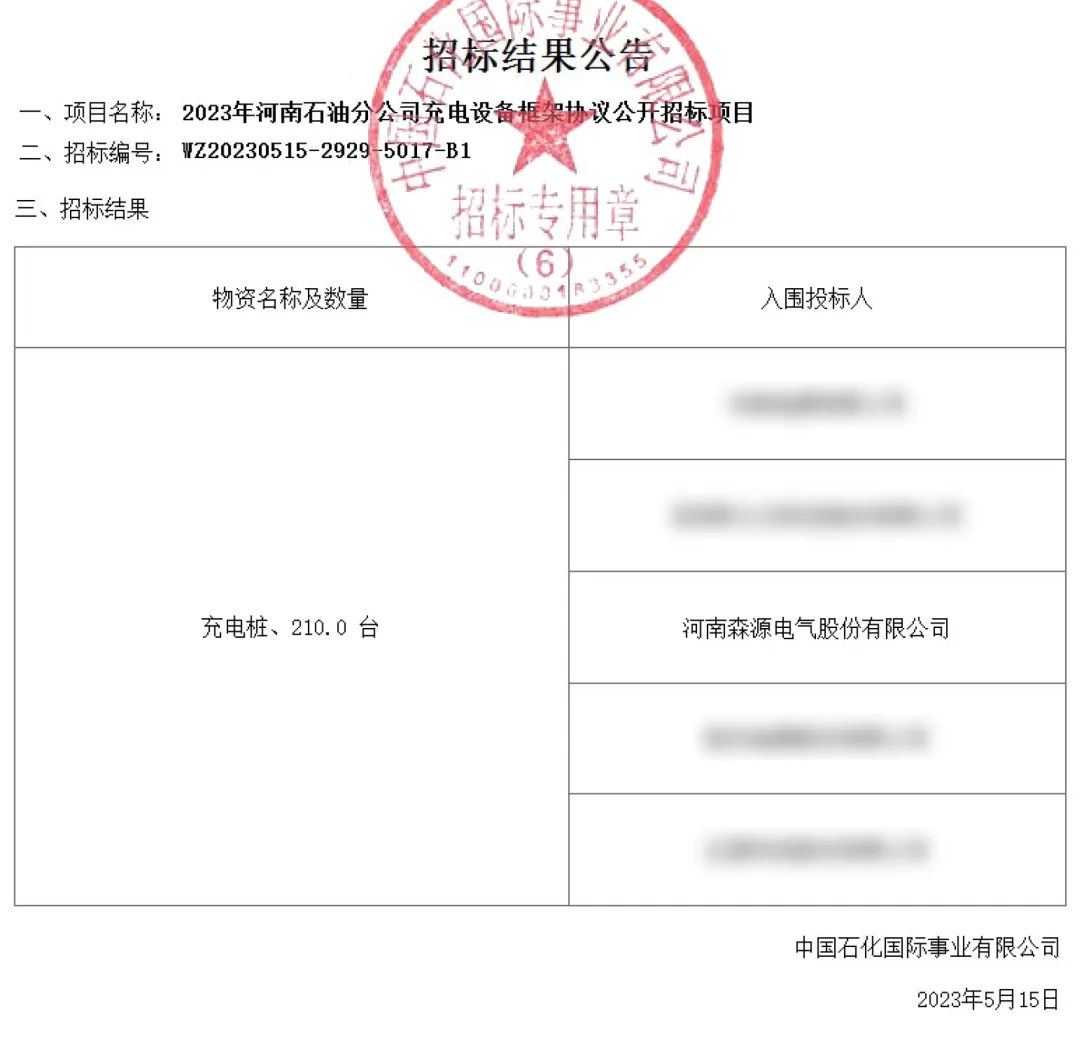 近日,河南森源电气成功中标中国石化河南石油分公司2023年充电设备框架协议招标项目。