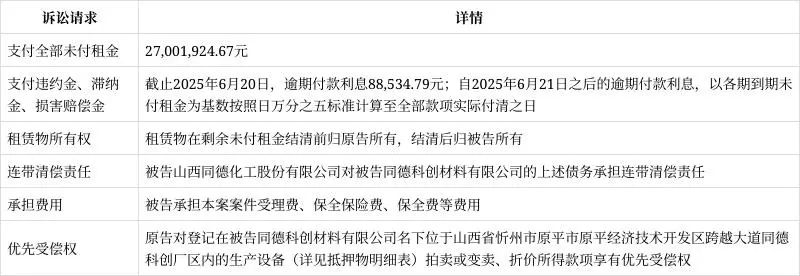 同德化工(002360)公告称,公司及全资子公司同德科创材料有限公司收到《西安市新城区人民法院传票》【(2025)陕0102 民初11025号】等相关法律文书,西安市新城区人民法院受理德银融资租赁有限公司起诉同德化工及全资子公司同德科创融资租赁合同纠纷一案,将于2025年8月25日开庭审理。涉案金额暂合计为人民币2709.05万。