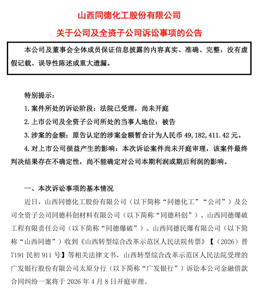 据公告,广发银行已就金融借款合同纠纷,将同德化工及其旗下同德爆破、同德科创、同德民爆三家核心全资子公司,连同实际控制人张云升、张烘、王晓霞共计七方被告诉至法院。