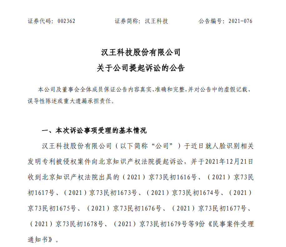 IPLaw获悉,今日,汉王科技股份有限公司发布公告称,公司于近日就人脸识别相关发明专利被侵权案件向北京知识产权法院提起诉讼。这次诉讼共计9个案件,原告均为汉王科技股份有限公司,其中8个案件的被告为熵基科技股份有限公司、北京京东世纪信息技术有限公司,剩余一个案件的被告为厦门熵基科技有限公司、北京京东世纪信息技术有限公司。