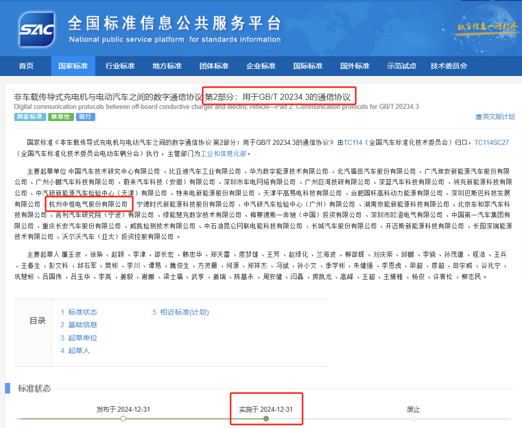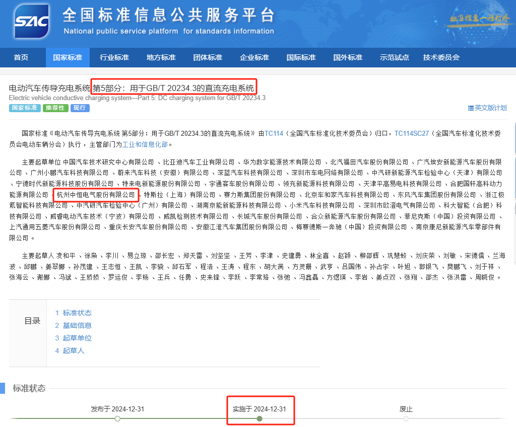 日前,国家市场监督管理总局、国家标准化管理委员会正式发布两项关于电动汽车充电的国家标准,中恒电气作为主要起草单位之一,为标准的制定贡献了重要力量。