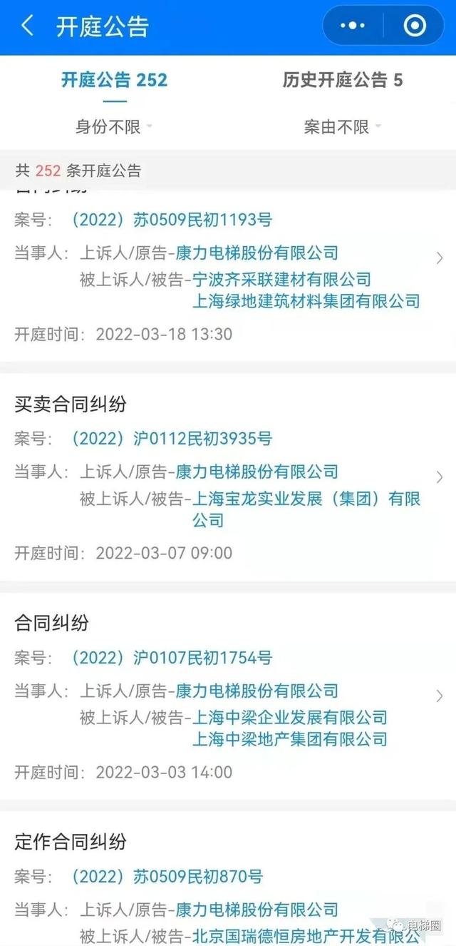 康力电梯从2021年底开始,连续起诉了绿地、中梁、宝龙、北京国瑞、万达、河南上置等房企。