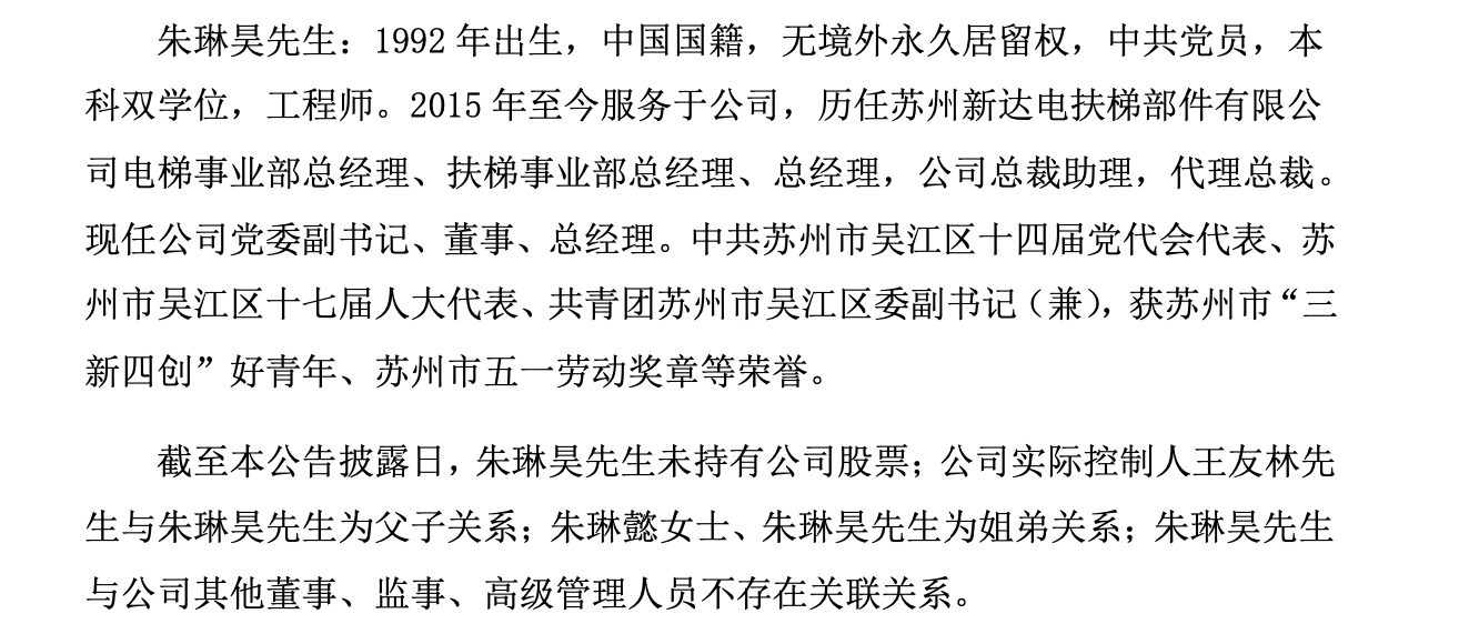 而继任者朱琳昊为1992年出生,中国国籍,无境外永久居留权,本科双学位,工程师。2015年至今服务于康力电梯,历任苏州新达电扶梯部件有限公司电梯事业部总经理、扶梯事业部总经理、总经理,公司总裁助理,代理总裁。