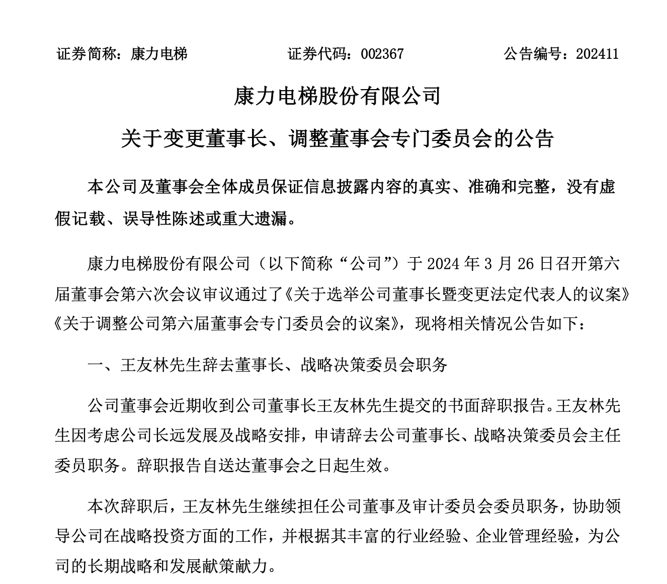 3月27日,康力电梯发布公告称,公司于2024年3月26日召开第六届董事会第六次会议审议通过了《关于选举公司董事长暨变更法定代表人的议案》《关于调整公司第六届董事会专门委员会的议案》。