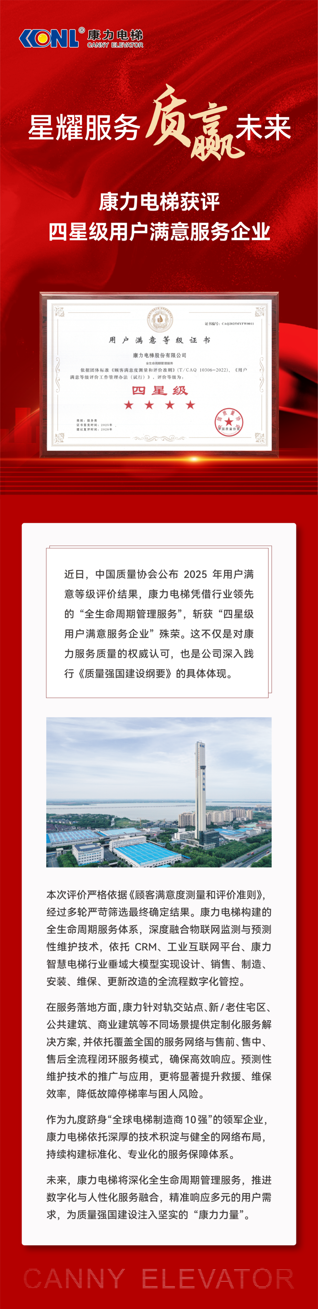 星耀服务 质赢未来 | 康力电梯获评“四星级用户满意服务企业”