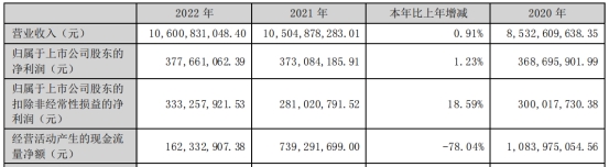 昨日晚间,太极股份发布2022年年度报告。2022年,太极股份实现营业收入106.01亿元,同比增长0.91%;归属于上市公司股东的净利润3.78亿元,同比增长1.23%;归属于上市公司股东的扣除非经常性损益的净利润3.33亿元,同比增长18.59%;经营活动产生的现金流量净额1.62亿元,同比下降78.04%。