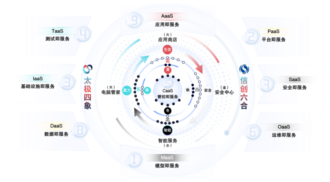 “四象”源自中国传统文化中的天人合一、时空一体的宇宙观,在此代表“算力、生态、安全、智能”四大产业核心能力。“六合平台”兼容六种CPU技术路线,提供八项云服务。