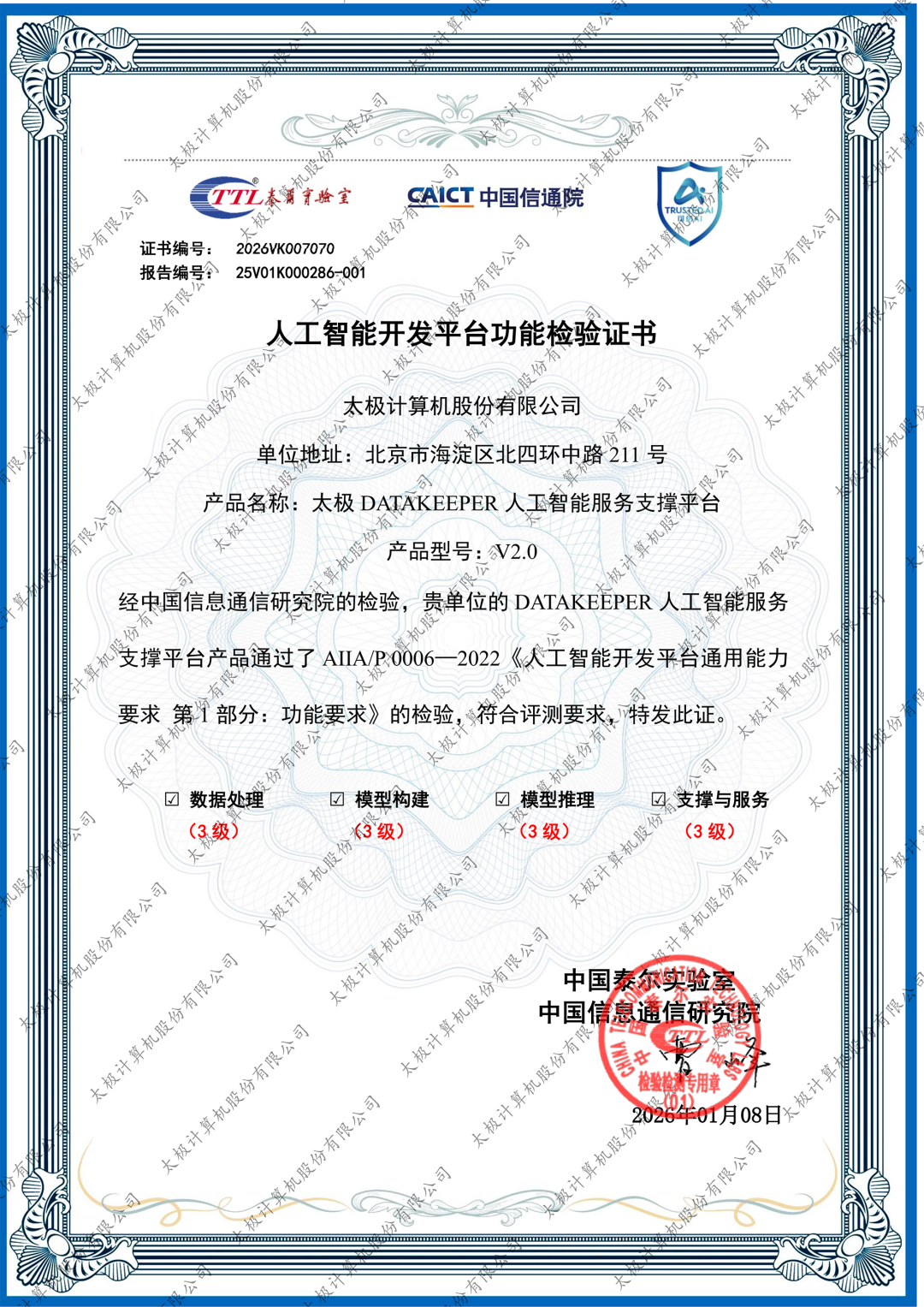 近日,太极股份自主研发的“DATAKEEPER”人工智能服务支撑平台,成功通过中国信通院“人工智能开发平台”的权威评测。该平台在数据处理、模型构建、模型推理、支撑与服务全部四大能力域,均达到3级(专业级)标准,标志着其在人工智能基础设施领域的自主研发实力与技术成熟度再次获得国家级权威认可。