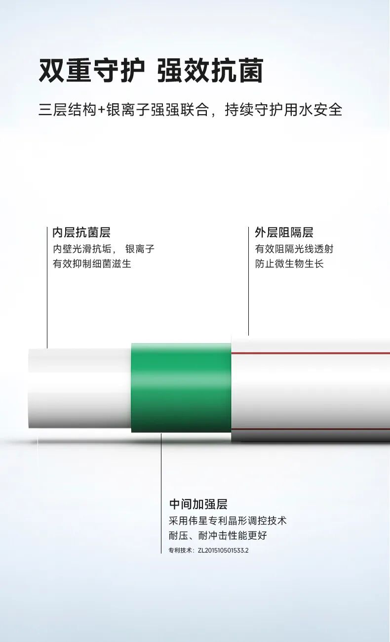这份荣誉的背后,是 伟星新材 以“专注提升人类生活品质”为使命,在抗菌技术领域的持续深耕。 伟星新材 研发推出水晶抗菌管,创新晶面技术,光洁的内壁减少细菌附着;采用银离子抗菌,对金黄色葡萄球菌、大肠杆菌有良好的抗菌效果,抗菌率达99.99%;三层结构,有效阻隔光线透射,不给细菌生长环境,为用水安全提供了强有力的保障。除产品研发外, 伟星新材 积极投身抗菌领域研究,为规范市场秩序贡献核心力量,牵头主编抗菌管标准T/CPPIA 49—2024《冷热水用抗菌无规共聚聚丙烯管材》,彰显在行业内的责任和担当,成为消费者心中的健康信赖品牌。