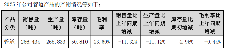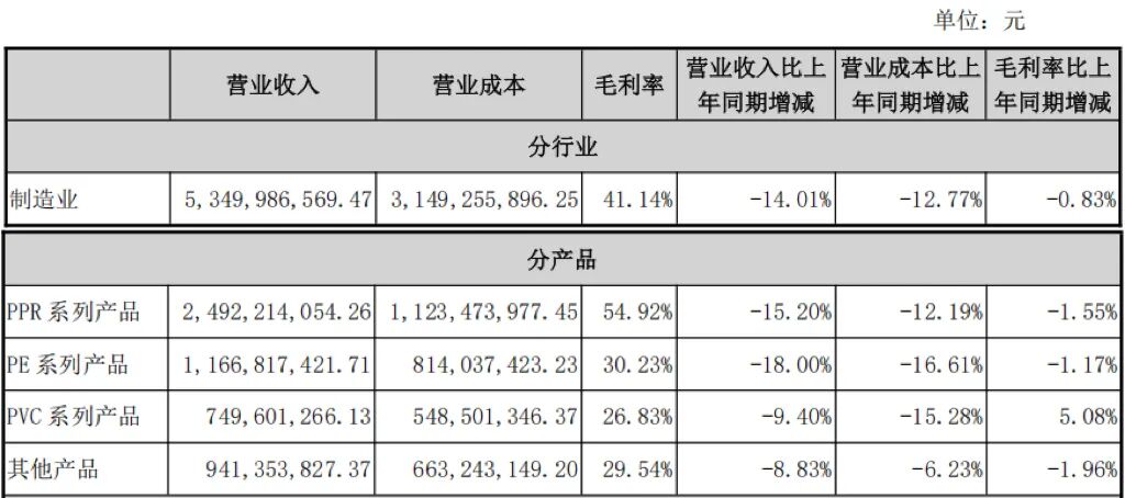 面对行业结构性调整,公司三大核心产品呈现差异化表现。PPR与PE系列营收分别下滑15.20%和18.00%,毛利率也同步小幅走低,主要受建筑与市政工程需求疲软影响。形成鲜明对比的是,PVC系列产品营收仅下滑9.40%,毛利率同比提升5.08个百分点至26.83%,成为唯一盈利改善的品类。这主要得益于2025年聚氯乙烯原材料价格持续下行,为公司提供了成本端支撑。